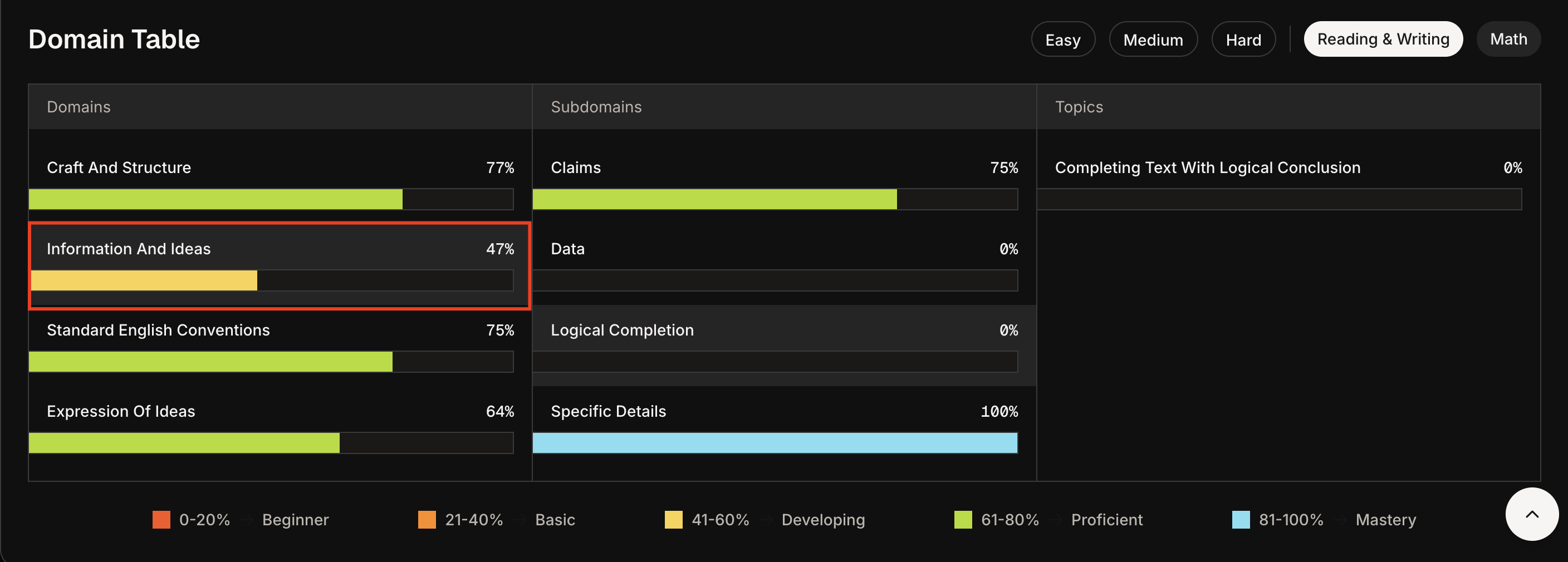 Here, the weakest parts are Information and Ideas Data as well as Logical Completion.
